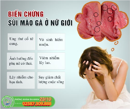 Tương tự như nam giới, sùi mào gà ở nữ có các nốt sùi cũng có thể xuất hiện ở một số nơi khác trên cơ thể người phụ nữ và gây ra tình trạng: tiết dịch âm đạo, ngứa ngáy, nóng rát, đau và/hoặc chảy máu khi quan hệ tình dục,...